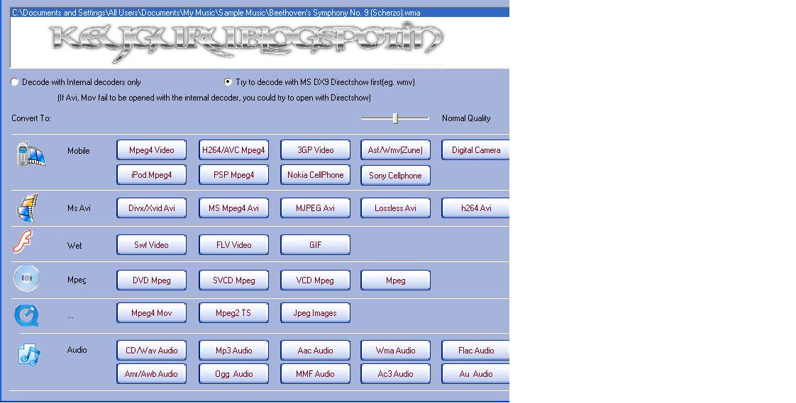 Gif Animation(.gif),DV (.dv),Output audio format:,MPEG audio (.mp3 & .mp2),Ms WAV (.wav),Ms WMA (.wma),OGG (.ogg),Amr audio (.amr),Amr audio(.awb),Mpeg4 audio(.m4a).